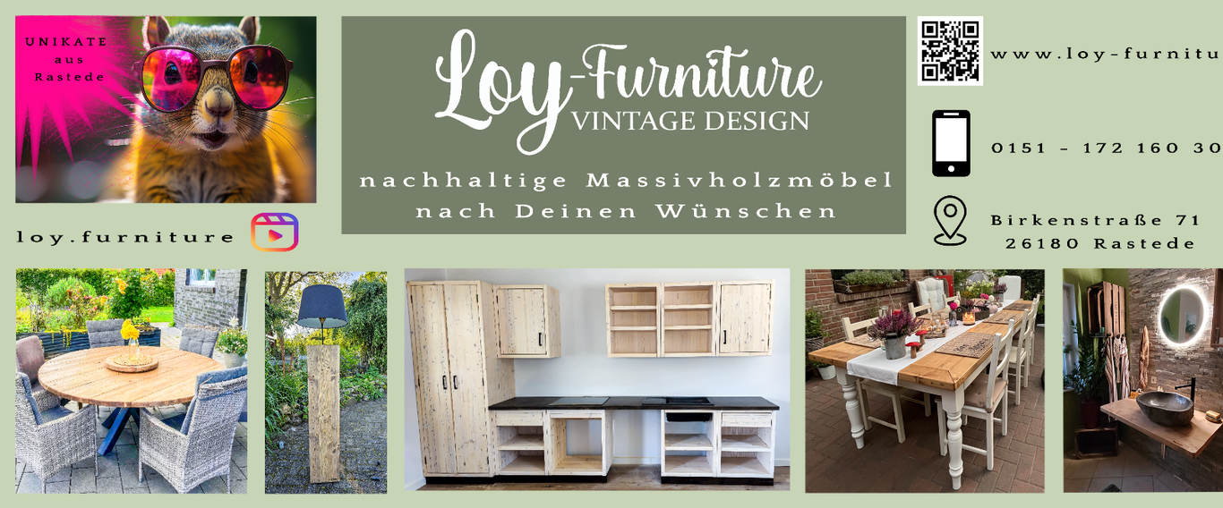 Für Loy Furniture gestalte ich hochwertige Bilder und Werbematerialien, die die einzigartige Handwerkskunst und Nachhaltigkeit der Möbel zeigen. Von der Produktfotografie bis hin zu Bannern und Werbeaktionen – ich setze eure Markenidentität visuell um und helfe dabei, die Geschichten hinter den Möbeln zu erzählen.